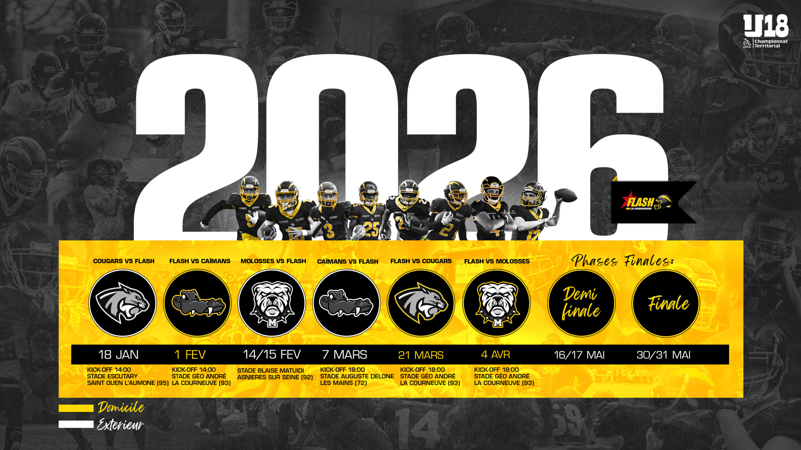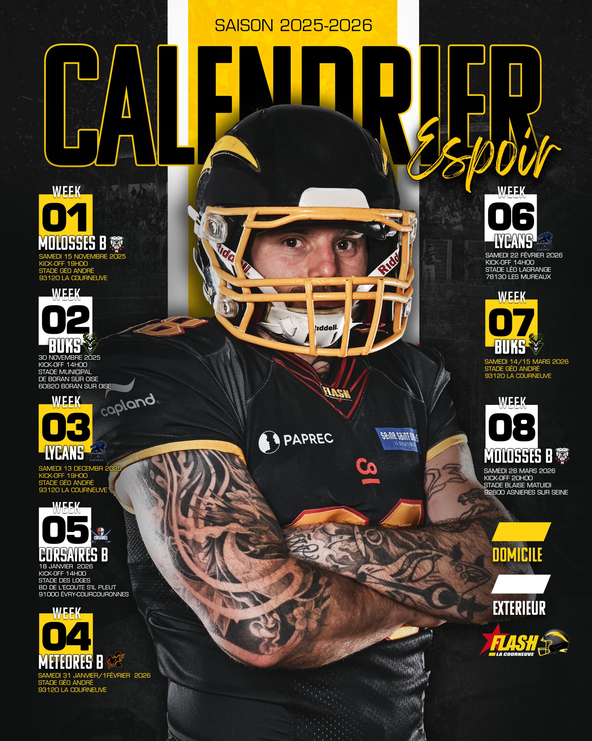 La saison régulière pour le champion en titre, débutera ce samedi 15 novembre avec la réception des Molosses B à 19h00 au Stade Géo André. Le Flash évoluera dans la poule Île-de-France Ouest au sein de la zone Nord-Ouest, où il affrontera les Bucks de Boran sur Oise, les Lycans des Mureaux et les Molosses B d’Asnières sur Seine. Deux matchs interpoules viendront compléter le calendrier face aux Météores B de Fontenay sous Bois et aux Corsaires B d’Evry.