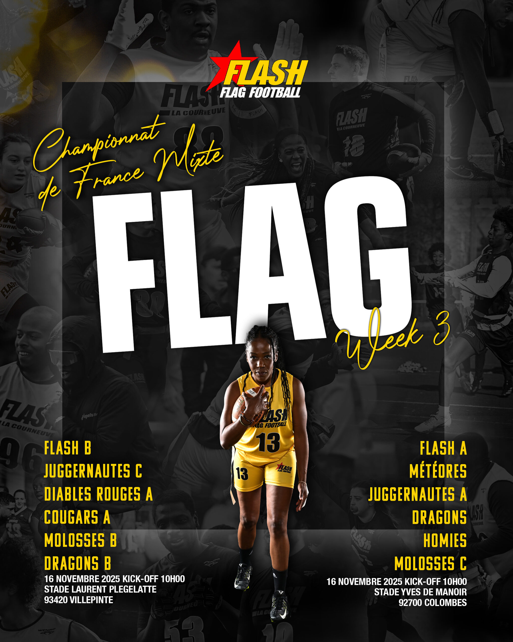 Ce dimanche 16 novembre, nos équipes seniors poursuivront leur parcours dans le Championnat de France de Flag Football Mixte. Lors de cette troisième journée de compétition nos deux équipes seront engagés sur différents terrains: