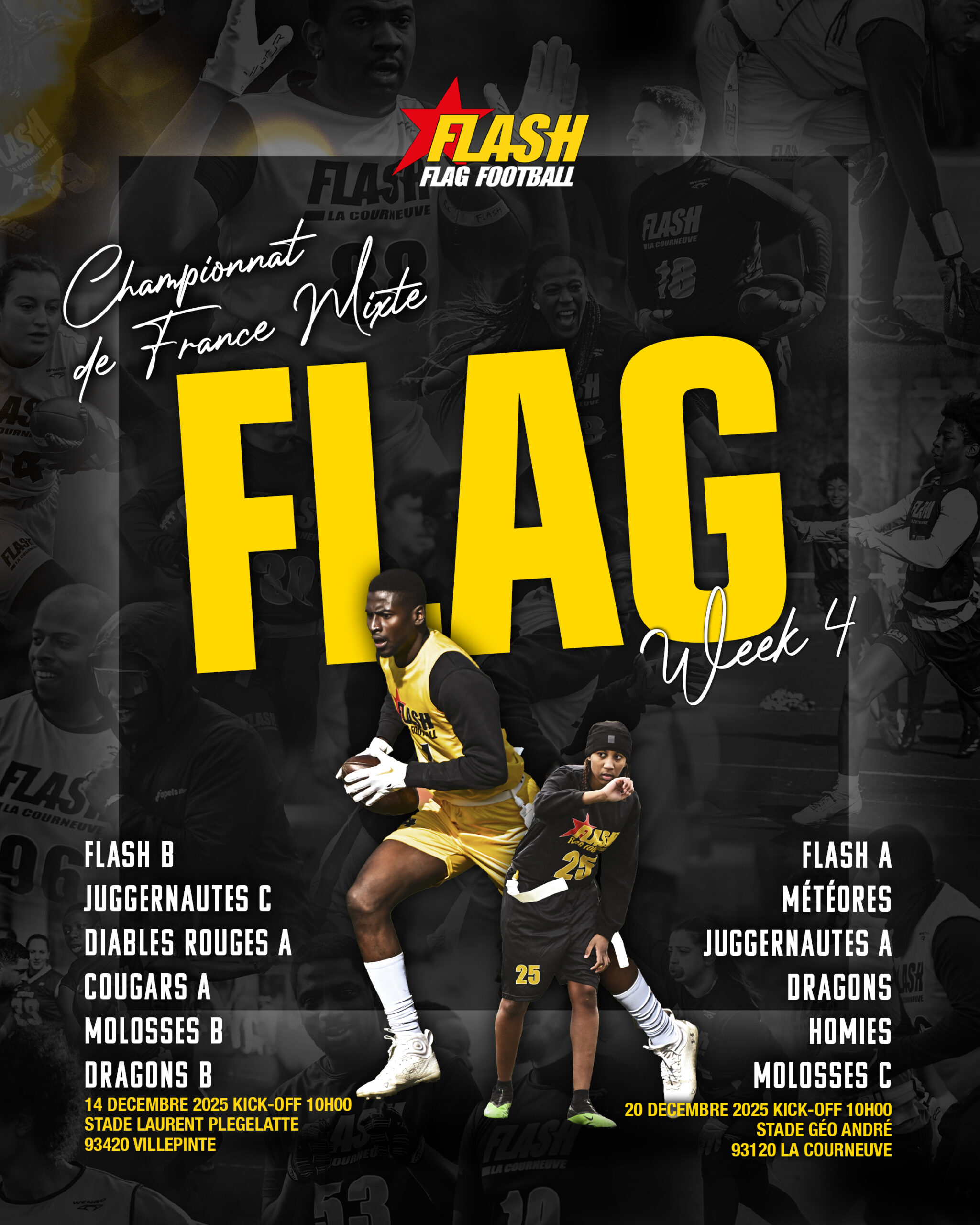 Ce samedi 6 décembre, nos U18 ont accueilli la quatrième journée du Championnat Île-de-France de Flag Football. Une fois encore, le Flash a démontré toute sa solidité et termine la journée invaincu, après quatre rounds de compétition.