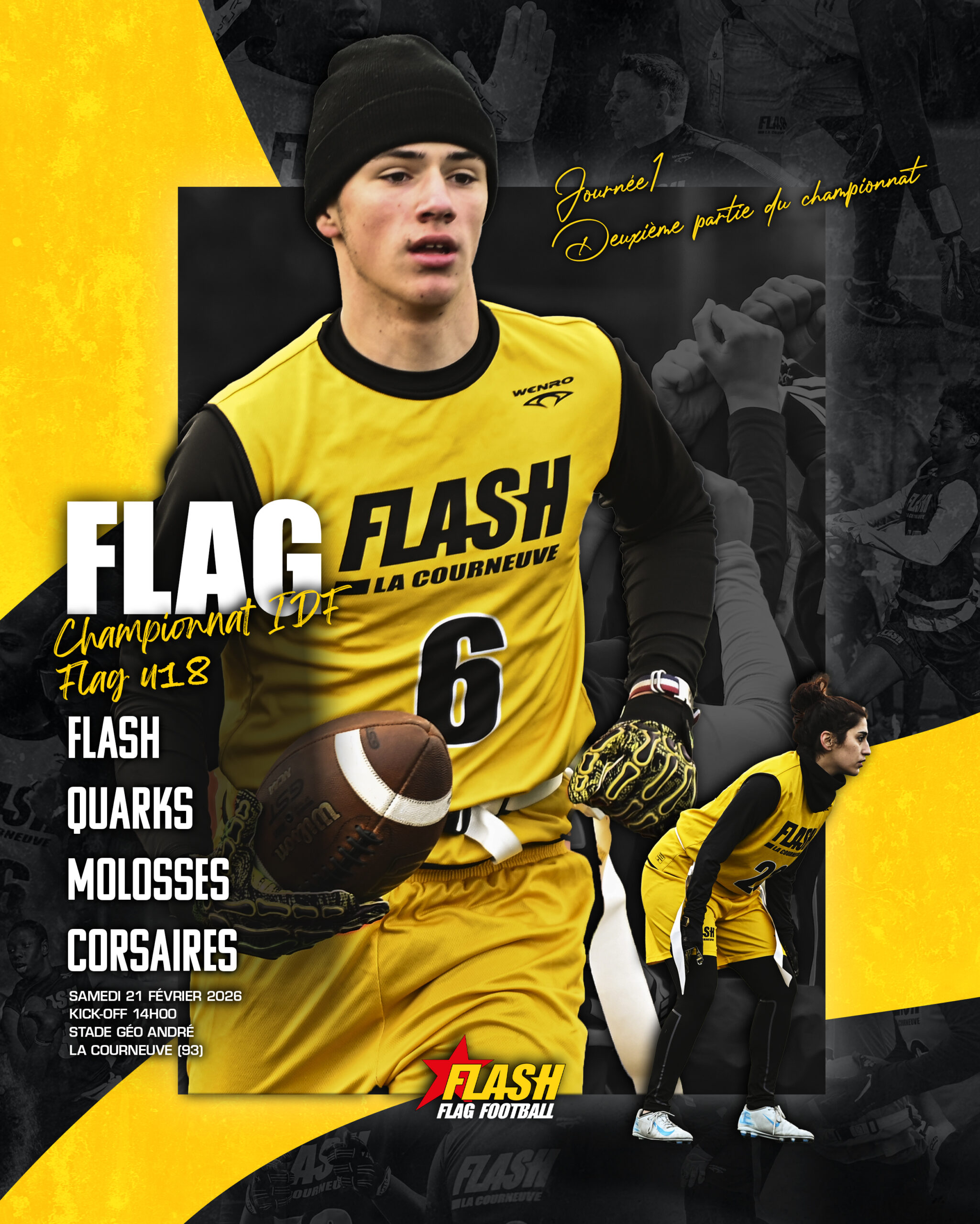 Le Flash organise ce samedi 21 février la 6ᵉ journée des Tournoi Flag Jeunes Ile de France (catégories U11, U13 et U15), en partenariat avec la Ligue Francilienne de Football Américain (LFFA) et le Comité Départemental de Football Américain de Seine-Saint-Denis (CDFA 93).