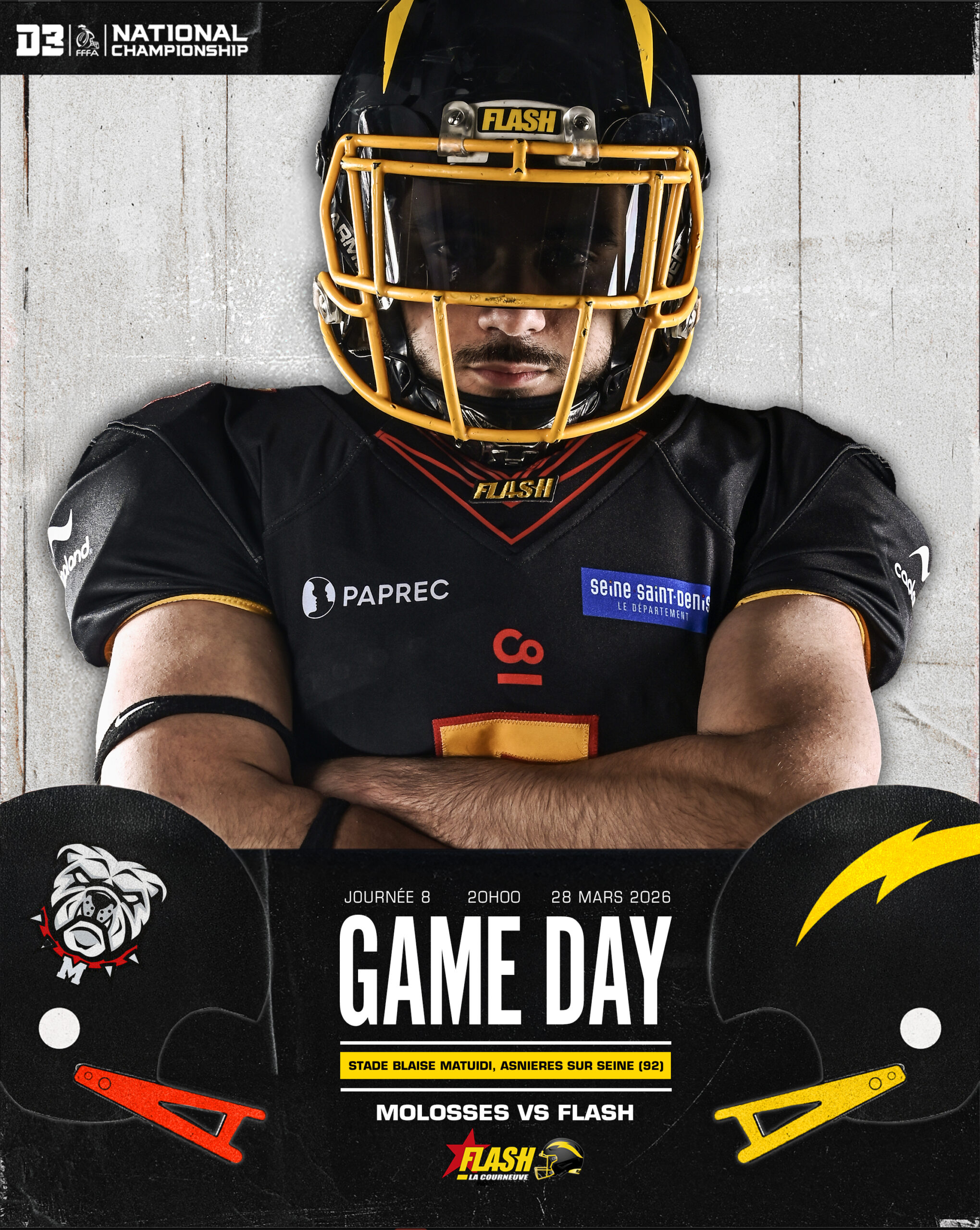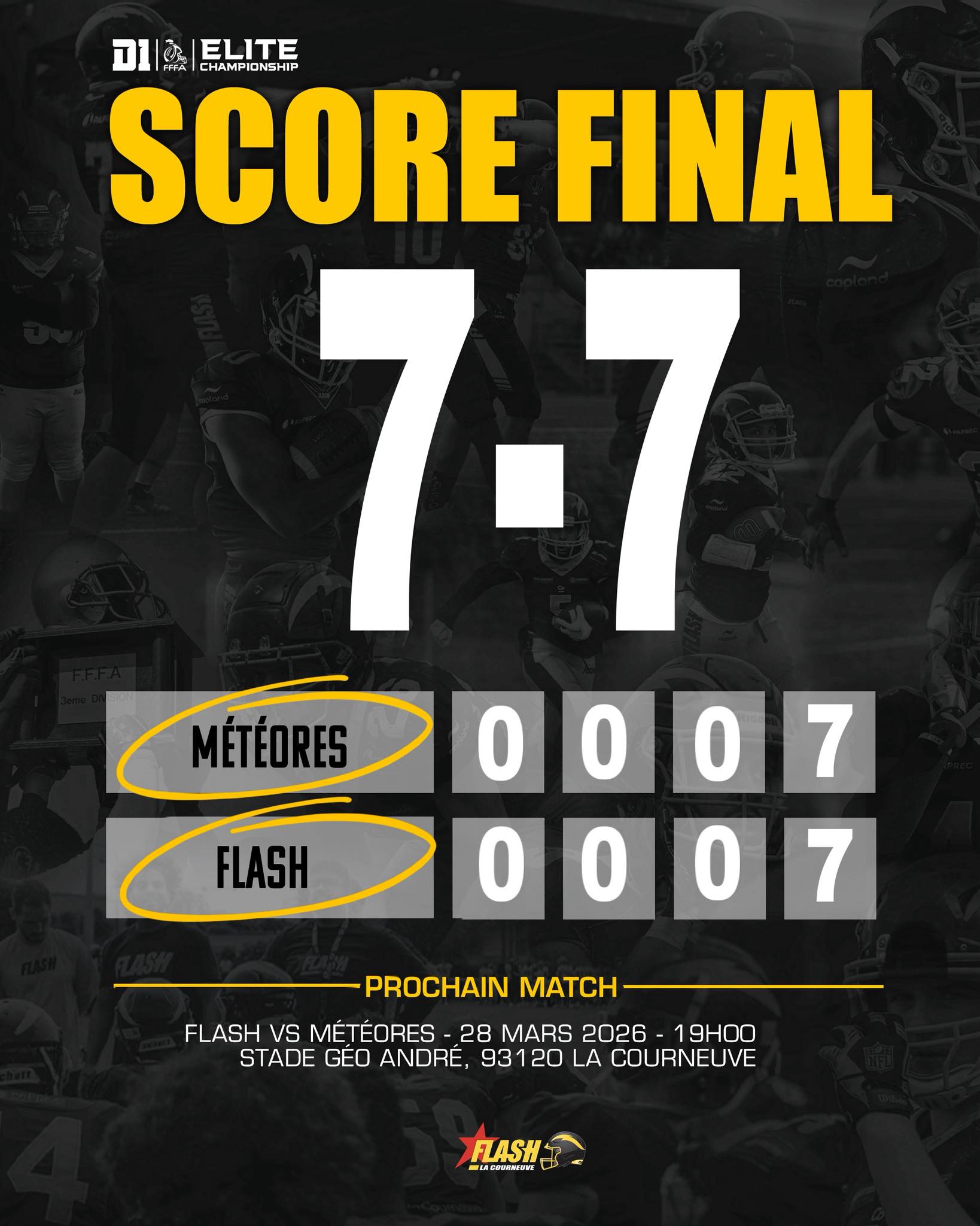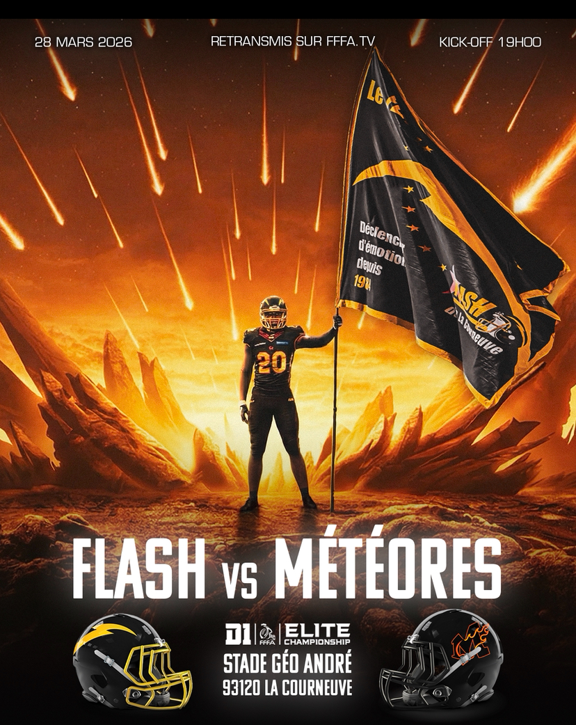 Le 28 mars à 19h00, venez assister au 6ᵉ match du championnat national Élite « Casque de Diamant 2026 » qui opposera le Flash aux Météores au Stade Géo André à La Courneuve !