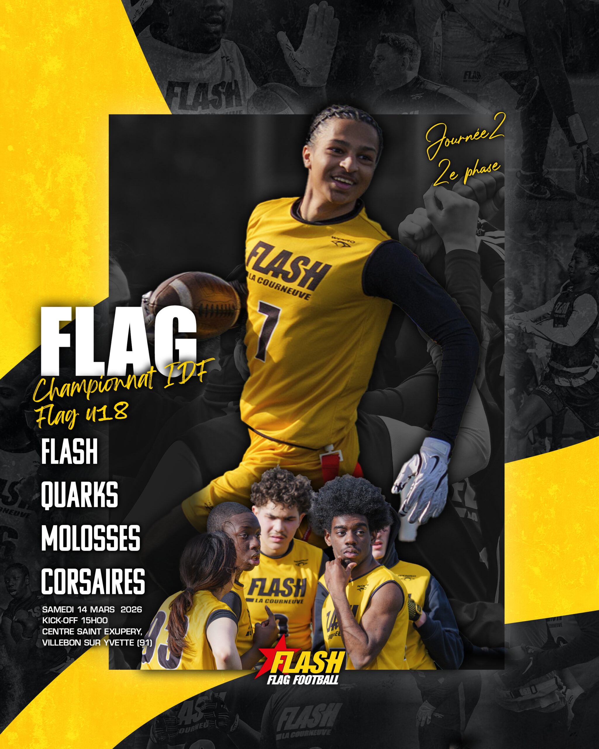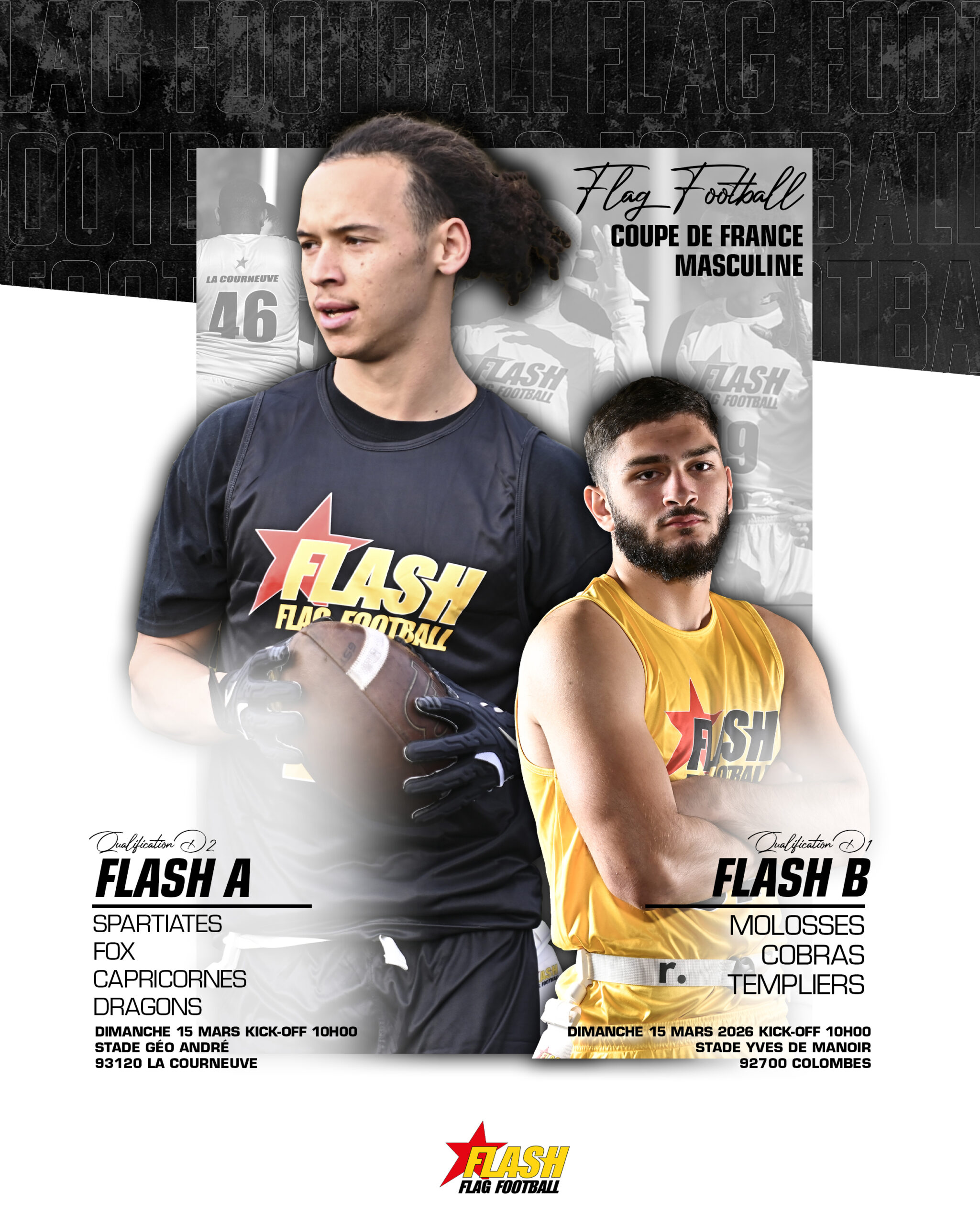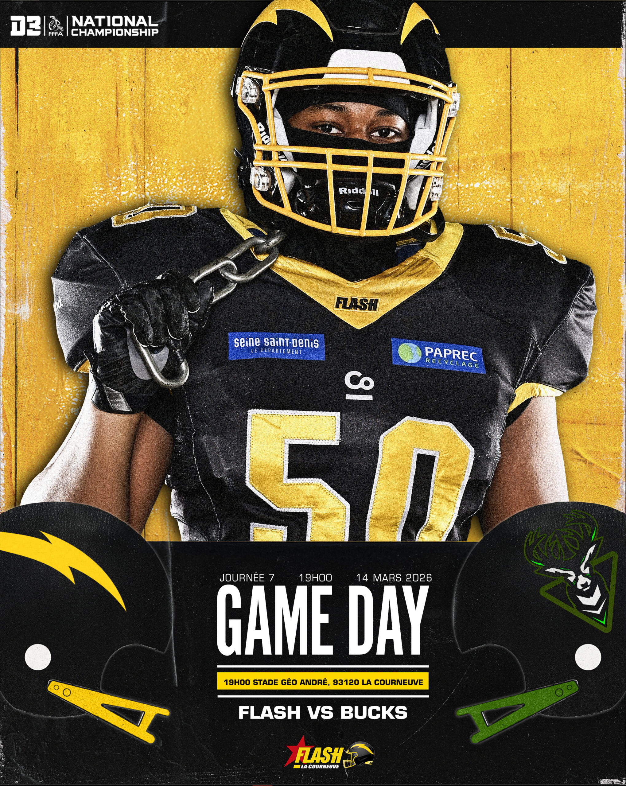 Le 14 février à 19h00, venez assister au 2ᵉ match du championnat national Élite « Casque de Diamant 2026 » qui opposera le Flash aux Black Panthers au Stade Géo André à La Courneuve !